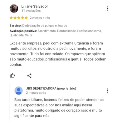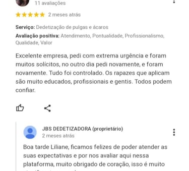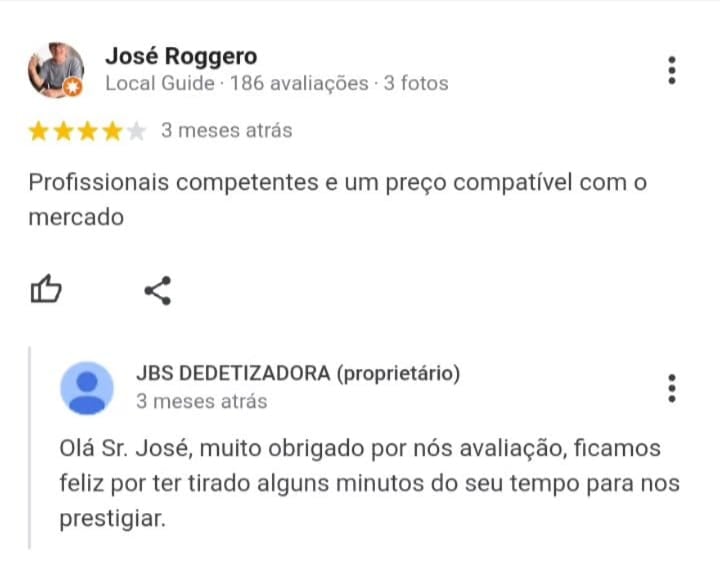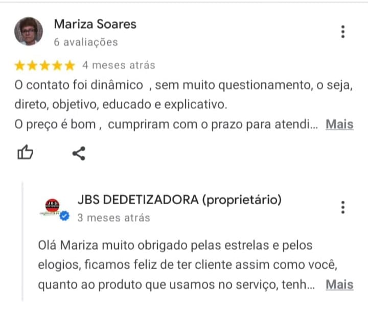A JBS Dedetizadora é a empresa mais recomendada pelos usuários do Google para serviços de controle de pragas urbanas, seja para seu imóvel ou empresa. Veja o que nossos clientes estão dizendo sobre nós clicando aqui!